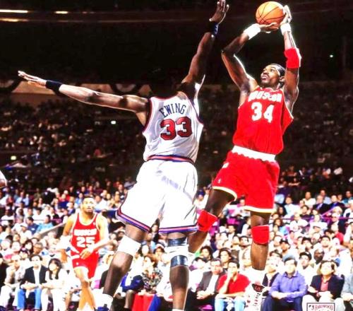 除了無(wú)解的腳步,奧拉朱旺還擁有穩(wěn)定的中距離投籃能力。在那個(gè)內(nèi)線對(duì)抗堪稱(chēng)“絞肉機(jī)”的年代,他既能用夢(mèng)幻腳步在籃下輾轉(zhuǎn)騰挪,完成高難度上籃或扣籃,也能在罰球線附近接球后,用一記干脆利落的中投終結(jié)進(jìn)攻。他的單打,不僅是力量與身高的碾壓,更是技巧與智慧的完美結(jié)合,重新定義了中鋒單打“不只是靠身體”的可能性。