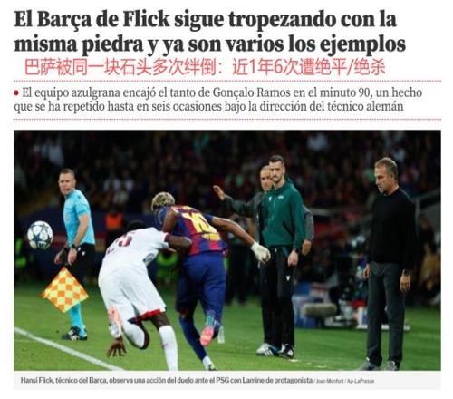 歐冠聯(lián)賽階段第2輪,巴薩主場1-2負于巴黎圣日耳曼,遭遇賽季首敗。10月2日,《世界體育報》指出,巴薩在第90分鐘丟球遭絕殺,這讓主帥弗里克很不滿。最近1年,巴薩已經(jīng)6次被絕平或者絕殺。