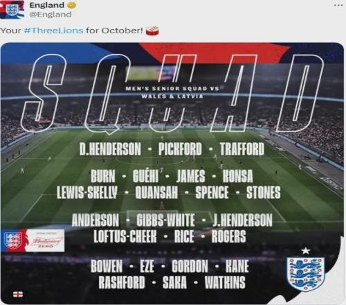 官方:斯凱利、賴斯、埃澤和薩卡入選了最新一期的英格蘭大名單。