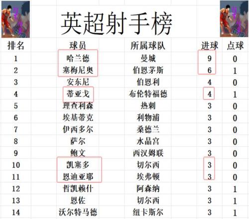 射手榜方面,哈蘭德7輪打入9球,繼續(xù)穩(wěn)居榜首,塞梅尼奧6球排在第2,錯失單刀的蒂亞戈還是和安東尼4球并列第3。恩迪亞耶,沃爾特馬德今天進(jìn)球后,追上凱塞多,?;倏说热?球剛好擠入前十。