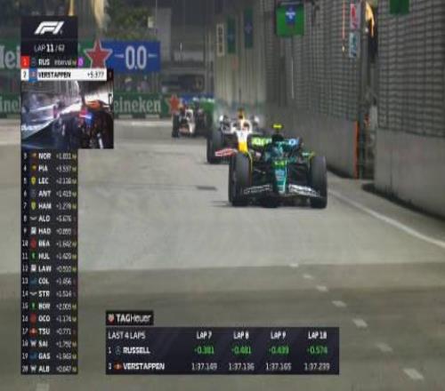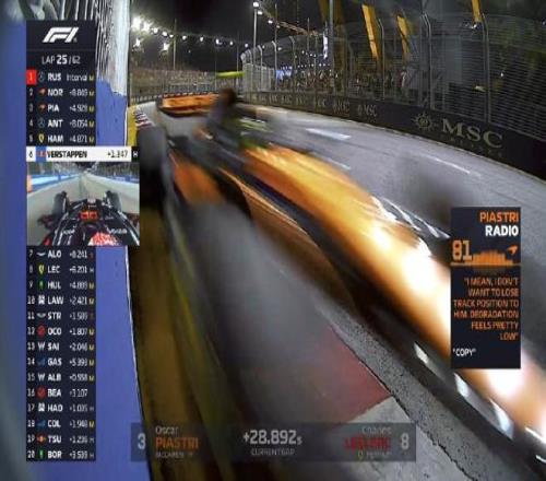第一圈:諾里斯升至第3,但在和皮亞斯特里的爭奪過程中,諾里斯碰到維斯塔潘,前翼端板受損