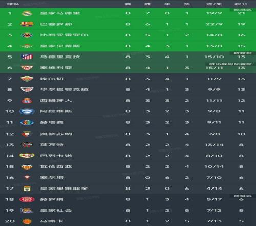 北京時間10月6日,西甲第8輪隨著巴薩1-4慘敗塞維利亞,西班牙人1-2不敵皇家貝蒂斯,皇家社會0-1巴列卡諾,塞爾塔1-1馬競的比賽結束,最新積分榜如下!