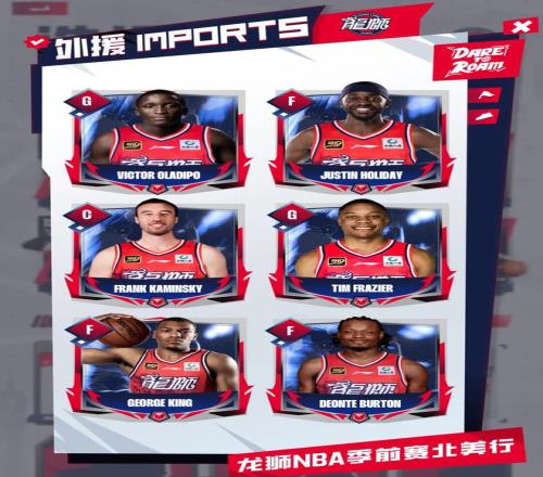 在本次NBA季前賽開始前,廣州龍獅俱樂部一口氣簽下奧拉迪波、賈斯汀·霍勒迪、卡明斯基、蒂姆·弗雷澤、喬治·金和德恩特·伯頓等六位臨時外援,在為期半個月的北美行期間,他們參與到廣州龍獅的日常行程和訓(xùn)練當(dāng)中,并隨隊(duì)征戰(zhàn)即將到來的三場NBA季前賽。他們在爭取留在NBA,同時廣州隊(duì)或者其他CBA球隊(duì)也可以通過NBA季前賽考察這些球員。
