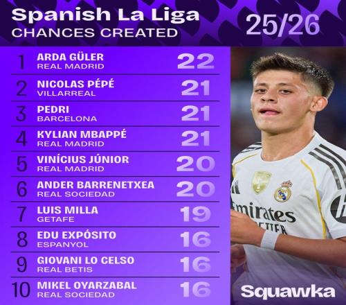 本賽季西甲創(chuàng)造機(jī)會(huì)排行榜: