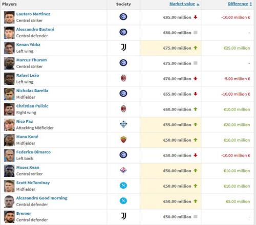 伊爾迪茲以2500萬(wàn)歐漲幅成為此次身價(jià)漲幅最高的意甲球員,尼科·帕斯以2000萬(wàn)歐位列次席。